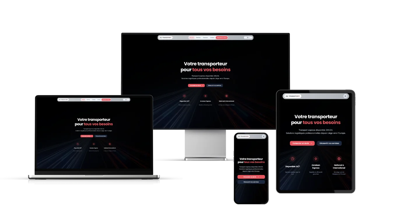 Site vitrine professionnel pour un transporteur basé à Liège, conçu pour mettre en avant la réactivité, les services et la demande de devis.